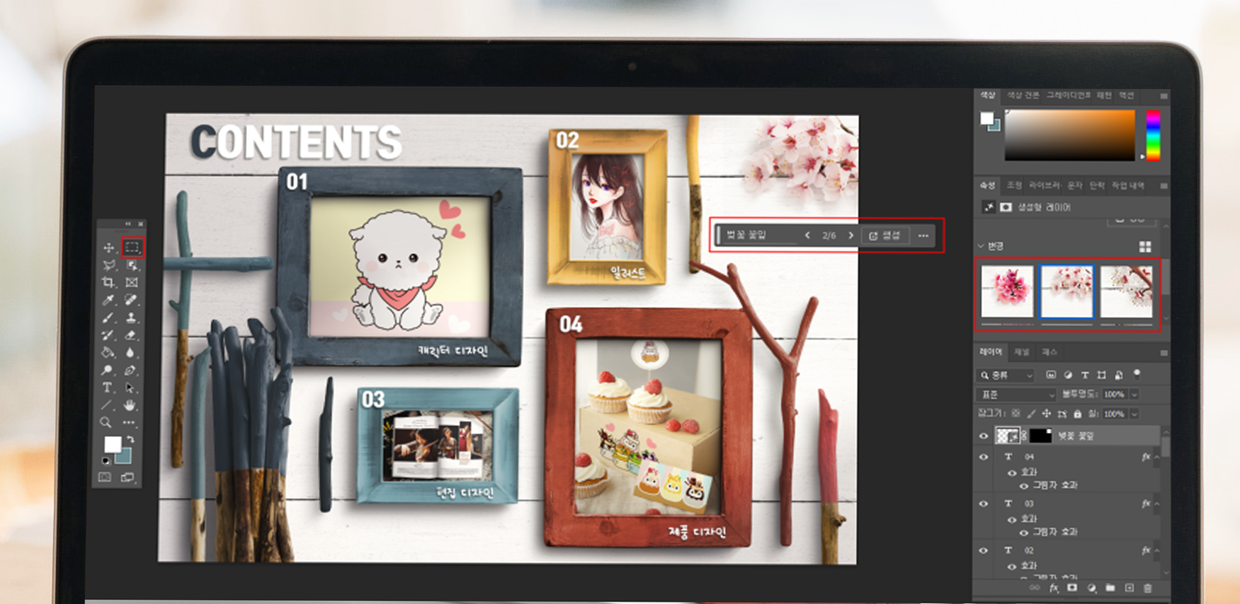 2. 포토샵을 연 뒤 다운로드한 포트폴리오 양식을 열었어요. 포트폴리오 템플릿은 직접 수정 가능하도록 레이어가 오브젝트 별로 나뉘어져 있습니다. 나뭇가지 오브젝트를 움직여 배치를 바꾼 다음 [수평 문자 도구] 로 텍스트를 수정하고 [레이어 스타일]을 누른 뒤 [드롭 섀도]에서 그림자를 만들어 줍니다.